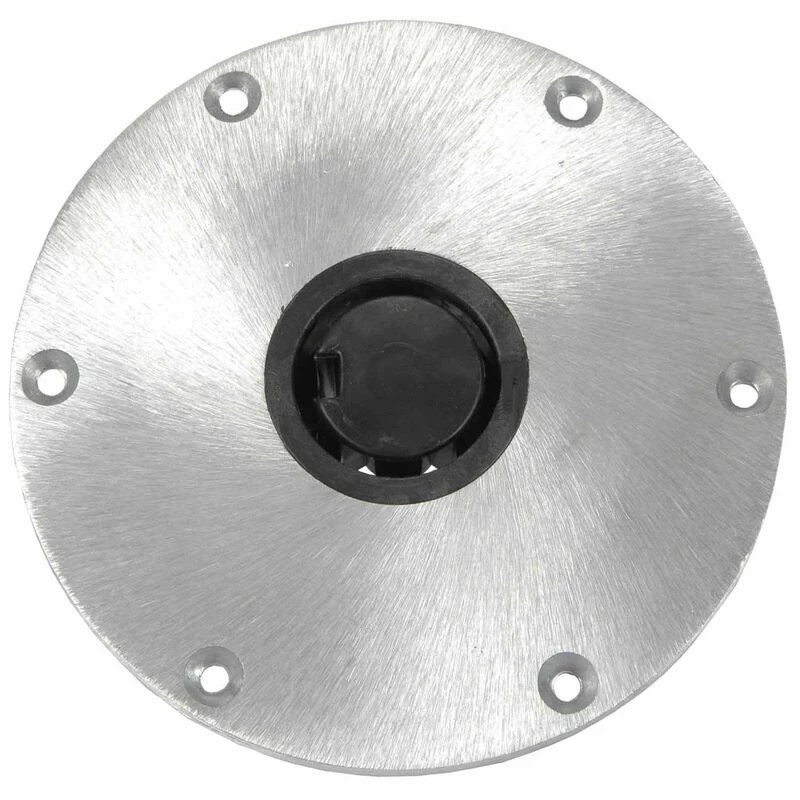 9″ round base with 8″ round mounting hole pattern, high strength aluminum with satin finish. Below the deck mount requires a 3-3/4″ hole in deck.