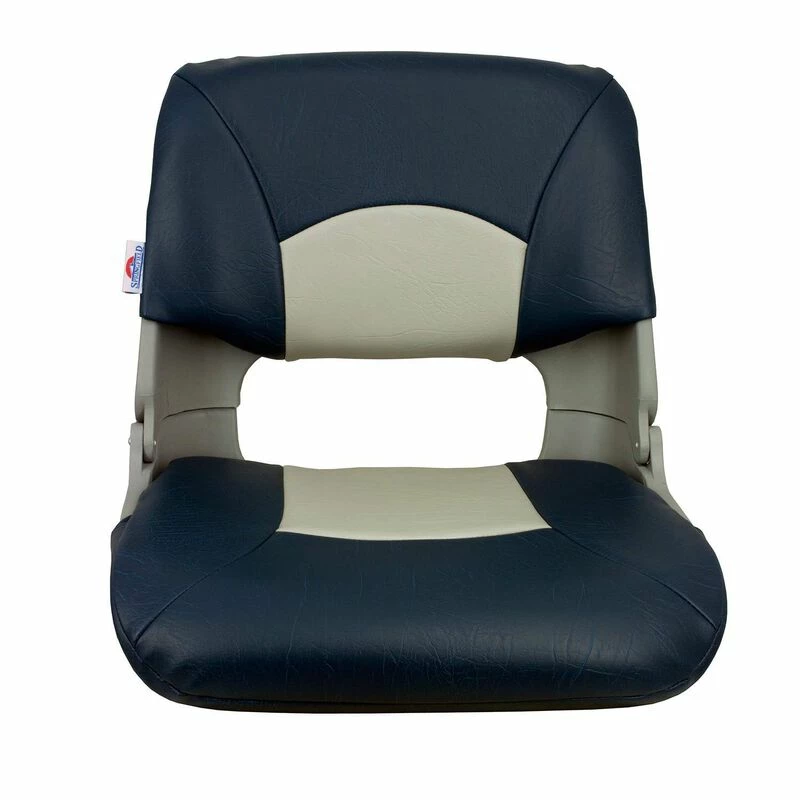 Injection molded seats with interlocking hinge for greater structural support. Extra wide seat, premium high quality upholstery for all day comfort, with synthetic boat fabric weather resistant, mildew resistant, optimal UV protection.