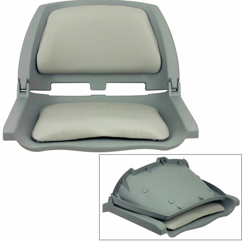 Cushioned seating surface features durable foam padding, covered with marine-grade vinyl. Snaps securely into place onto heavy duty injection-molded shell that folds for easy storage and travel. Quick dry construction and heat-sealed seams. Five year warranty. 14 1/2″H x 20 1/2″W x 18″D