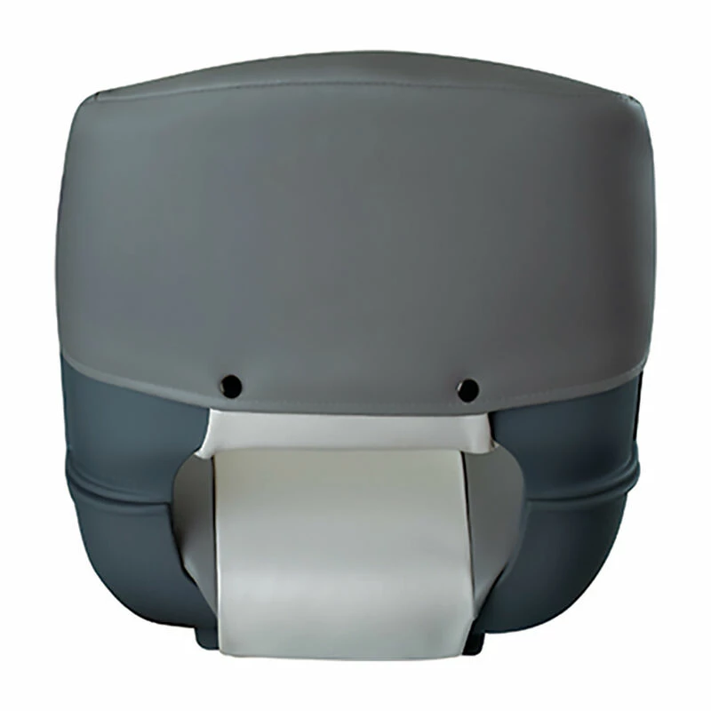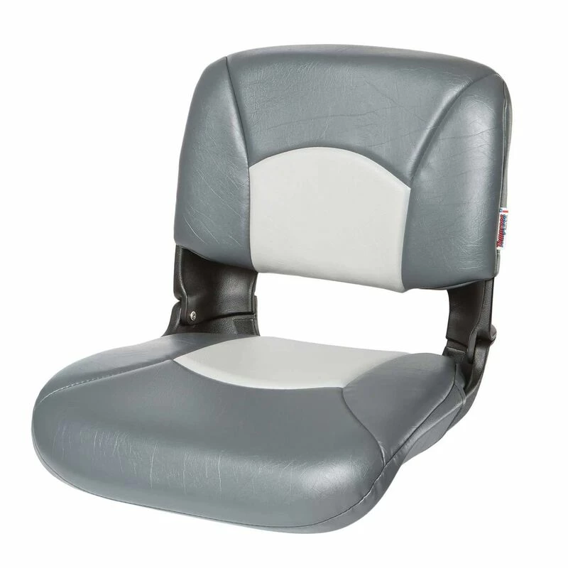 This folding seat features all-weather, heavy-duty construction and snap-on vinyl cushions with sealed, high-density foam inserts. Double-contoured seat pan minimizes pressure points for all-day comfort on the water and stainless-steel hinge pins secure the seat back in the folded position.