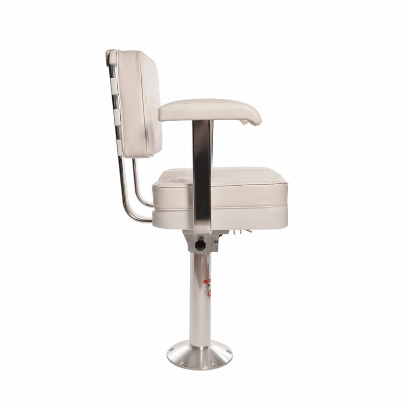 Classy and comfortable, the Gloucester Deluxe Ladder-Back Captain’s Chair is ideal for many center console or flybridge installations. Quality components include a high-density, rot-proof polyethylene base and a strong back comprised of anodized aluminum supports with “ladder-style”, UV-resistant polyethylene cross pieces. The seat and the back boast extra-thick, tufted, removable cushions, which like the armrests are covered with marine-grade vinyl. Package includes chair, removable marine-grade vinyl cushions and positive-locking swivel/slider mount that allows for 360° rotation and fore and aft adjustment. Pedestal is 15″ high with a 2 7/8″ diameter and has a 9″ diameter base.