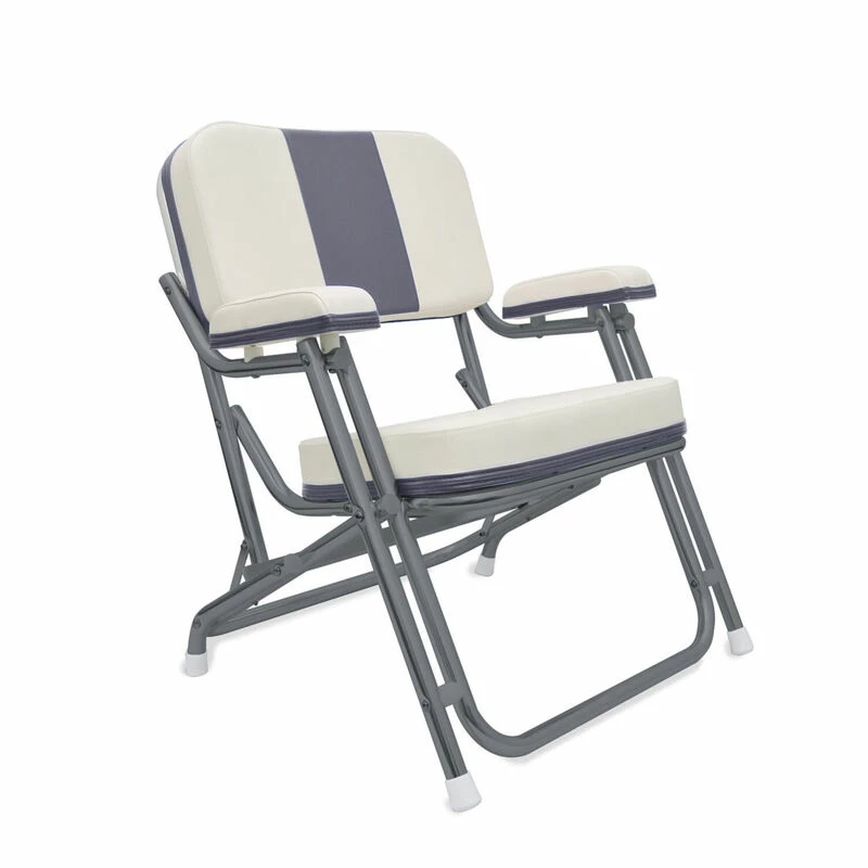 This classic aluminum framed deck chair features resilient foam cushions that are contoured for increased comfort. The high quality, water resistant vinyl and stainless steel hardware makes it durable to with stand tough elements. Add on the safety catch to prevent accidental folding and non-marking feet, and this chair proves to be a great value.
