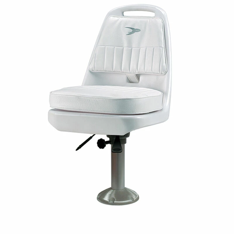 Wise 8WD013 Standard Pilot Chair & Pedestal Combo Features 8WP23-15-374 15″ fixed ABYC class AD driver pedestal with seat slide. Chair is constructed with thick wall rotational molded plastic frame with pre-mounted plastic injection molded mounting plate with T-nut inserts. Snap on and off cushions have high compression foam padding with mesh underlay to expel moisture. UV and mildew treated marine grade vinyl with embossed vinyl surface and embroidered logo. Pedestal features polished cast aluminum 9″ base plate with recessed knurled mounting holes. 2 7/8″ diameter thick Wall extruded aluminum post. Cast aluminum seat mount swivels 360 degrees and locks down tight. Seat slide constructed of extruded aluminum with 5″ of fore and aft travel.