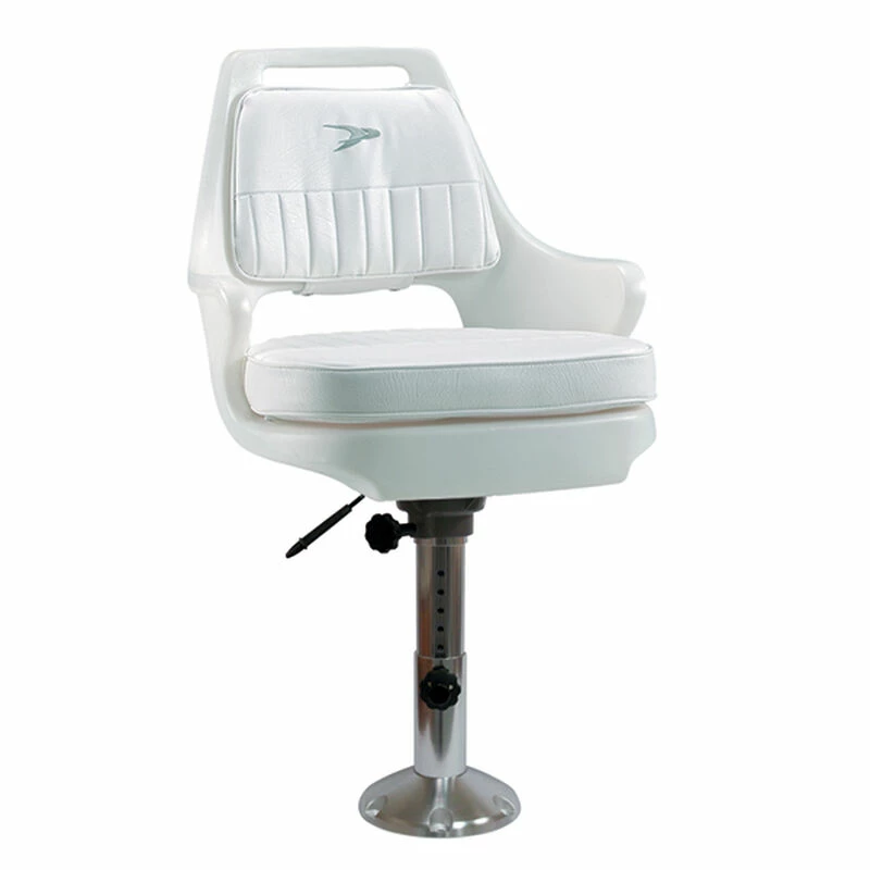 Wise 8WD013 Standard Pilot Chair & Pedestal Combo features 8WP21-374 ABYC class AD driver 12″ to 18″ adjustable pedestal with seat slide. Chair is constructed with thick wall rotational molded plastic frame with pre-mounted plastic injection molded mounting plate with T-nut inserts. Snap on and off cushions have high compression foam padding with mesh underlay to expel moisture. UV and mildew treated marine grade vinyl with embossed vinyl surface and embroidered logo. Molded arm rests. Pedestal features polished cast aluminum 9″ base plate with recessed knurled mounting holes. 2 7/8″ diameter thick wall extruded aluminum post. Cast aluminum seat mount swivels 360 degrees and locks down tight. Seat slide constructed of extruded aluminum with 5″ of fore and aft travel.